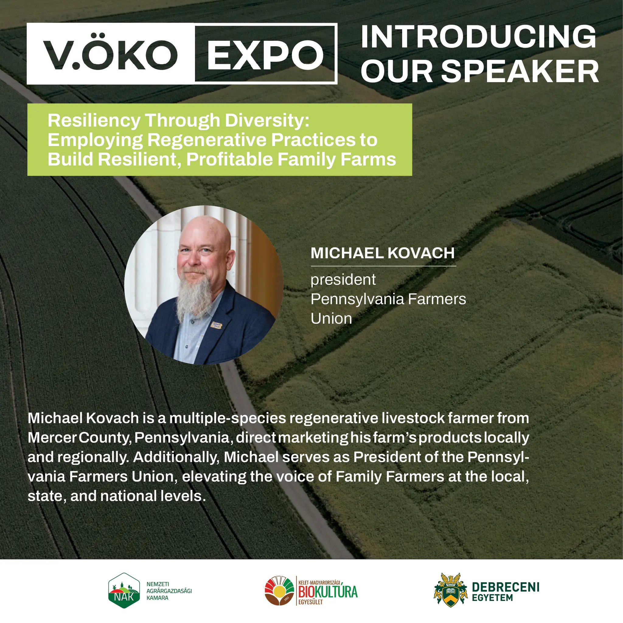 His presentation will take place between 10:50 AM and 12:00 PM on September 12th, 2024, in Kendereskert, Hajdúnánás. The title of his presentation is "RResiliency Through Diversity: Employing Regenerative Practices to Build Resilient, Profitable Family Farms."