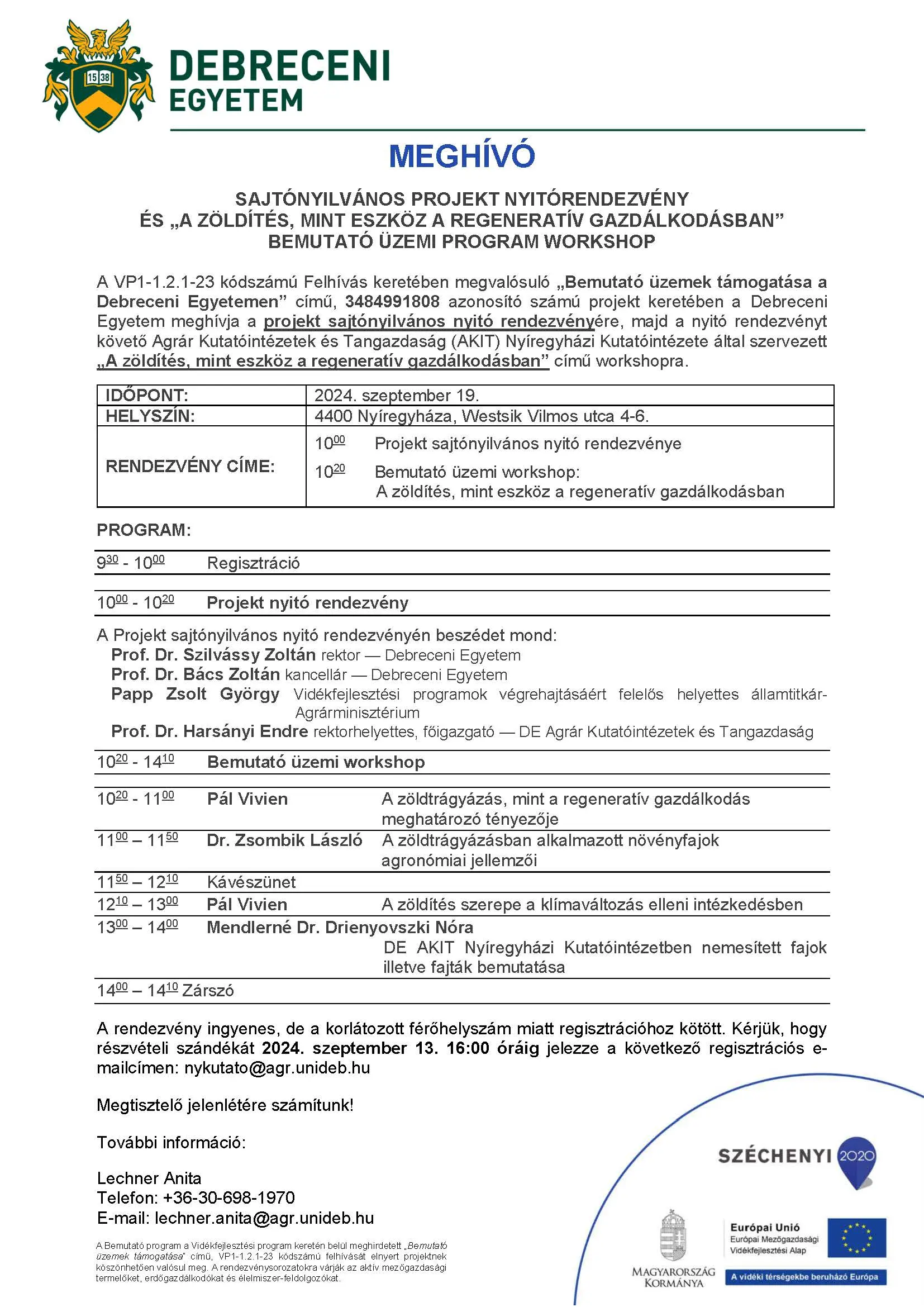VP1-1.2.1-23 kódszámú Felhívás keretében megvalósuló „Bemutató üzemek támogatása a Debreceni Egyetemen” című, 3484991808 azonosító számú projekt keretében a Debreceni Egyetem meghívja a projekt sajtónyilvános nyitó rendezvényére....