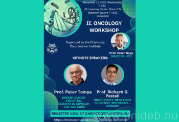 A Debreceni Egyetem Kémia Koordinációs Intézete ismét megrendezi az Onkológiai Workshopot. A november 12-i, szerdai program célja, hogy elősegítse a daganatos betegségek kutatásában részt vevő egyetemi és nemzetközi szakemberek közötti tudományos együttműködést, valamint bemutassa az onkológiai kutatások legújabb eredményeit. A workshopon több külföldi szaktekintély is előadást tart.